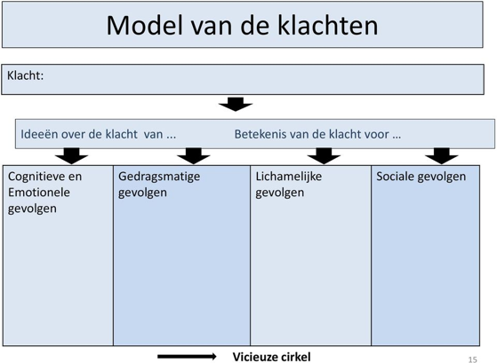Hierbij wordt gewerkt aan factoren die de klachten kunnen beïnvloeden. Het is te vergelijken met de SCEGS factoren maar dan net anders geordend.